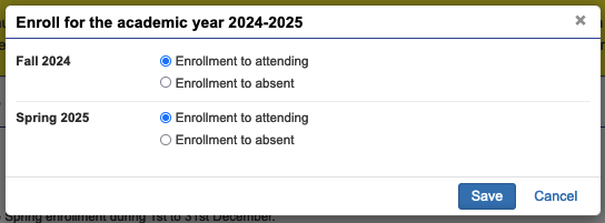 The student must enroll as present or absent for each academic year. Enrollment takes place in Peppi. Enrollment may be done during the enrollment periods.