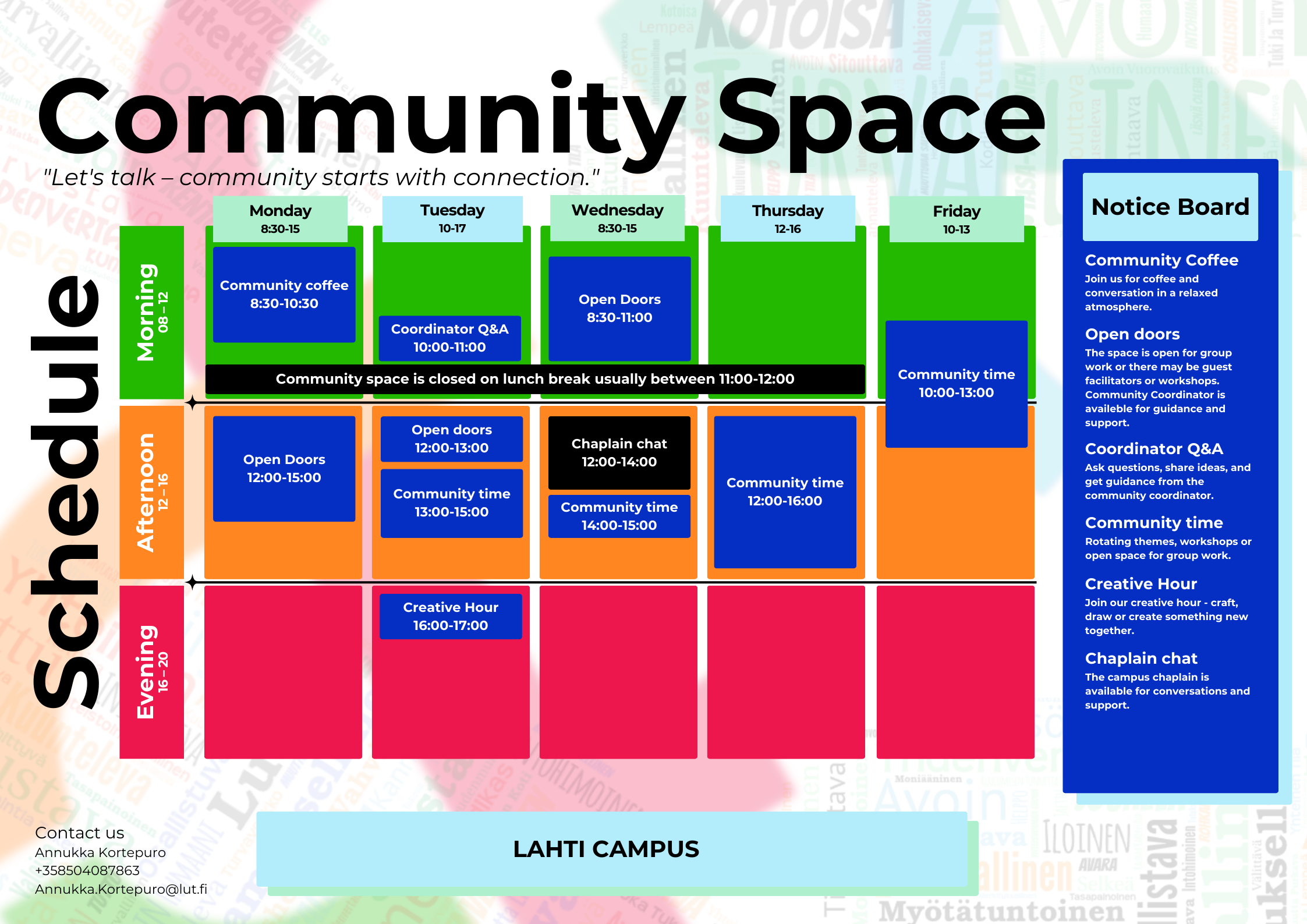 Breadcrumb Home Study guidance and support services Student support and wellbeing Student Community Coordinators Community Space Lahti Community Space Weekly schedule Monday Opening hours Tuesday Opening hours Wednesday Opening hours Thursday Opening hours Friday Opening hours