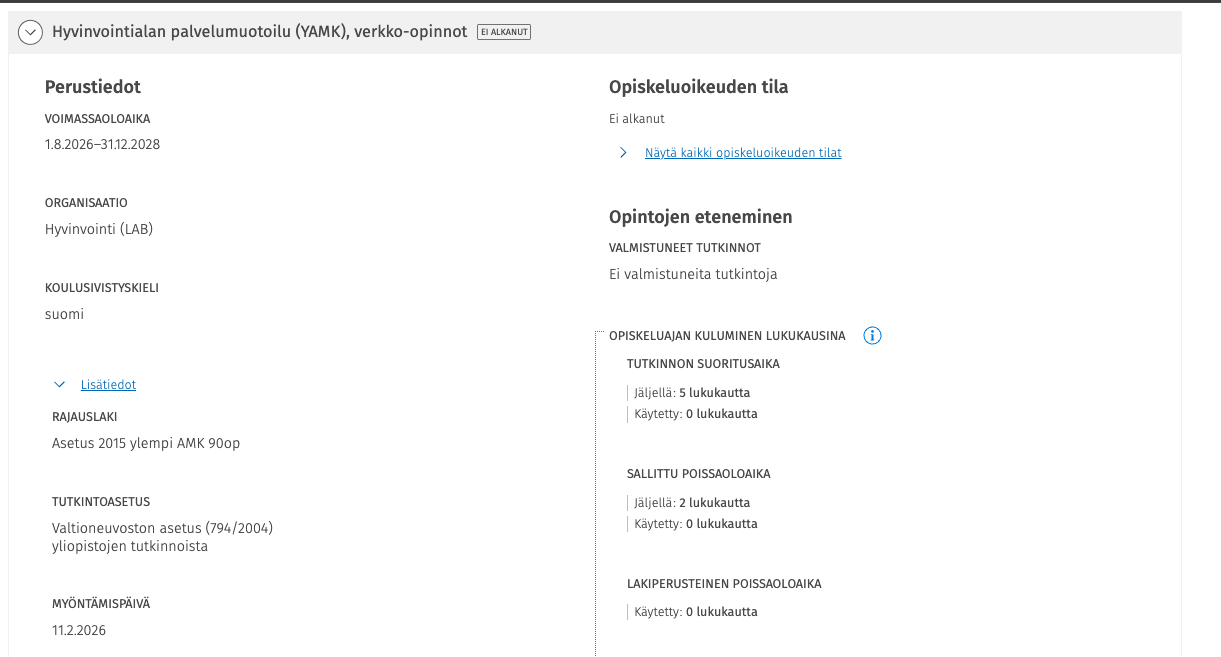 Opiskeluoikeuden nimen edessä olevaa pyöreää nuolikuvaketta klikkaamalla saa esille opiskeluoikeuden laajemmat tiedot, kuten opiskeluoikeuden voimassaoloajan, opintojen etenemisen ja läsnäolotiedot. Lisätiedot-painiketta klikkaamalla saa näkymiin opiskeluoikeuden rajauslain ja myöntämispäivän sekä opintojen aloituspäivän. Sivun alalaidassa kuvataan opiskeluoikeuden mukainen koulutuspolku sekä muut opiskeluoikeuteen liittyvät vahvistetut valinnat tutkinto-ohjelmakohtaisesti.